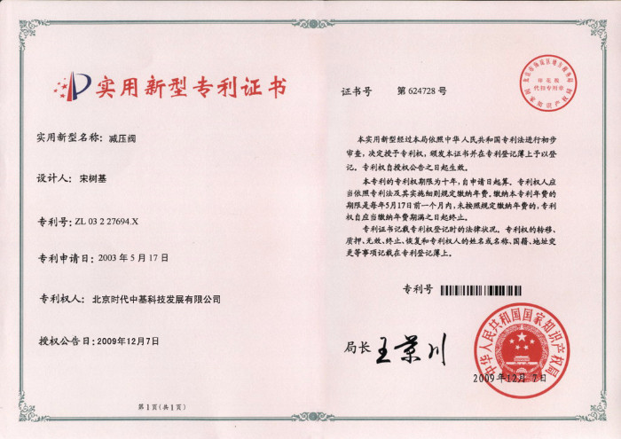 • 一種活塞式減壓閥專利證書